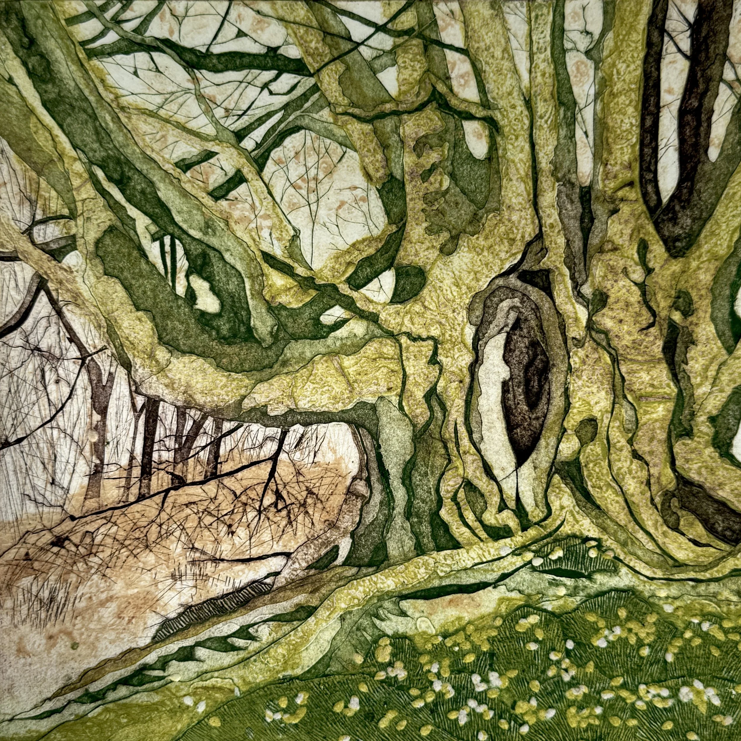 I am an artist and printmaker inspired by the natural world. Walking and drawing are my starting points, allowing me to explore and understand my subject before translating my experience into print. I am particularly drawn to trees—their forms, textures, and presence in the landscape—as well as the rhythms of walking, especially along the coast path. I work primarily with collagraphy, a process that allows me to explore surface and texture in depth. Through making plates, I search for ways to convey the structures, patterns, and atmosphere of the landscape, as well as my own movement through it.