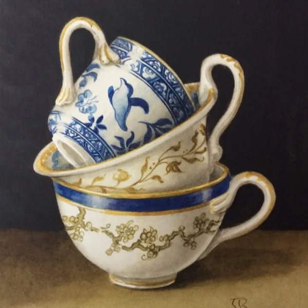 My watercolour still life paintings use a wide range of subject matter, fruit, flowers, decorated china and many other much loved bits and pieces from my happily cluttered shelves